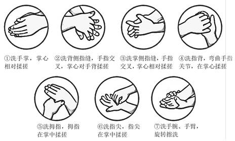 (3)按照“七步洗手法”(如图1-1)认真揉搓双手至少15秒钟,应注意清洗双手所有皮肤,包括指背、指尖、指缝和手腕;