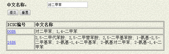 如:(1)按照中文名称检索。点击“按中文名称检索”,进入如下界面(见图2),输入中文名称“对二甲苯”,然后点击中文名称下方的“提交查询内容”,则出现两种化学物质,其化学品安全卡编号(即ICSC编号)分别为0086和1666,经分辨,0086对二甲苯是我们所要查询的物质,于是,点击编号0086,便查询到我们想查询的内容,见图3。