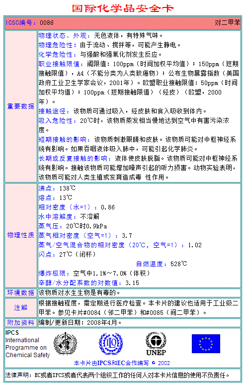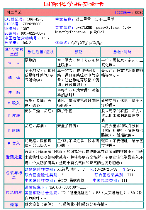(2)按照英文名称检索。如上述方法同,点击“按英文名称检索”,输入英文名称“para-xylene”,然后点击英文名称下方的“提交查询内容”,则出现一种化学物质,其化学品安全卡编号(即ICSC编号)为0086,正是我们所要查询的物质,于是,点击编号0086,便查询到上述图3所示的化学品安全卡片。
